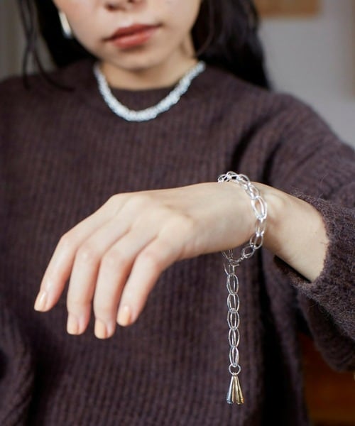 ボリュームで存在感のあるチェーンは、お好きな長さでお使いいただけるので、手首に直接でも、長袖の上から付けていただくことも可能です。